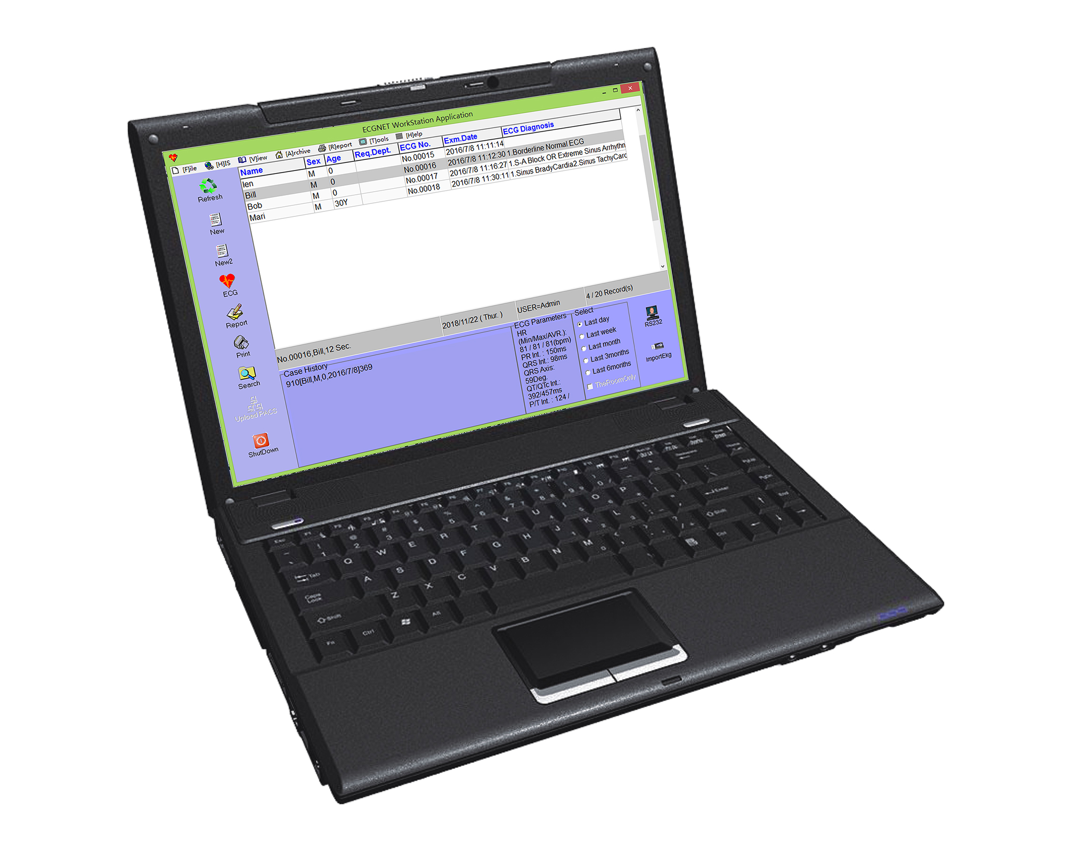 Can record detailed patient information, including name, ID, gender, age, height, weight, blood pressureand hospital name.